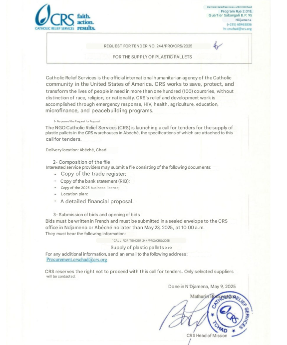 Supply of plastic pallets in the CRS warehouses in Abéché. T... ***** Supply of plastic pallets in the CRS warehouses in Abéché. T... *****