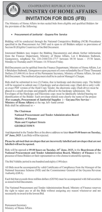 Procurement Of Janitorial-Guyana Fire Service Tender Notice... ***** Procurement Of Janitorial-Guyana Fire Service Tender Notice... *****